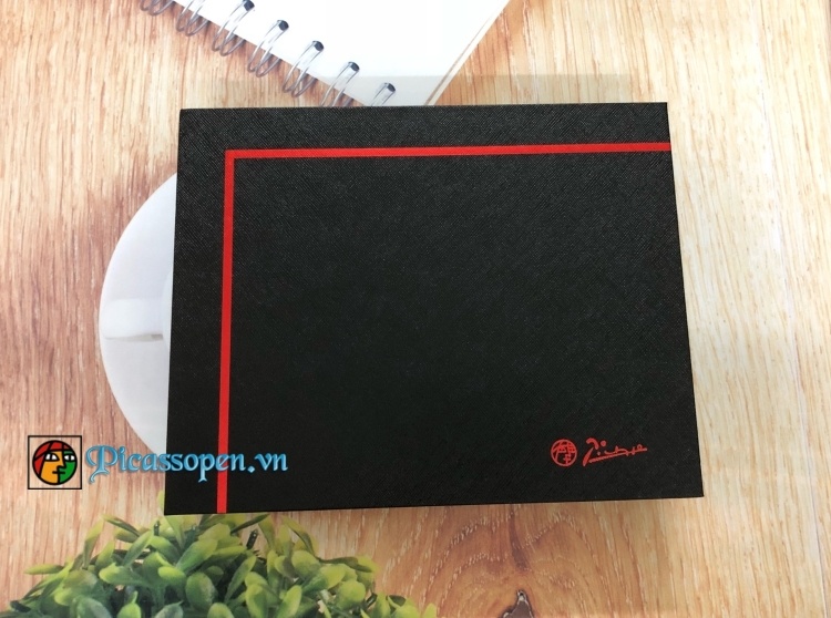 Hộp quà bằng nhựa cứng bọc giấy cứng giả da màu đen bóng rất sang trọng. Kích thước hộp quà 250mm x 200mm x 54mm