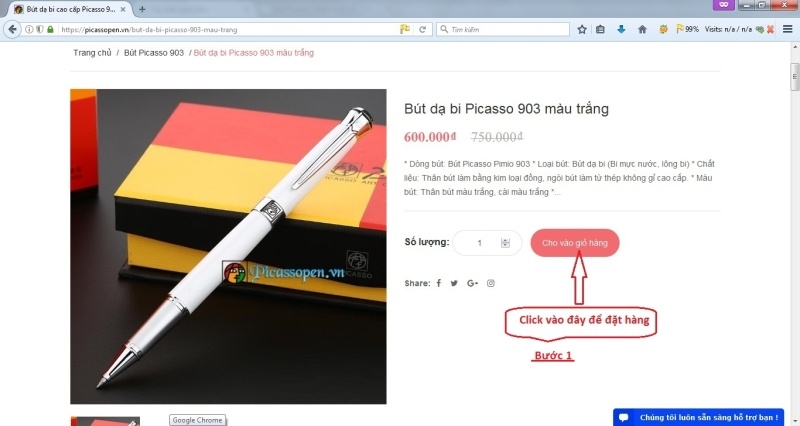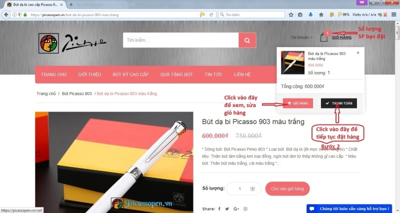 2. Đặt hàng qua Website: Quý khách truy cập vào website picassopen.vn, xem sản phẩm theo danh mục sản phẩm, lựa chọn loại bút cần mua, nhấn vào CHO VÀO GIỎ HÀNG Sản phẩm Quý khách muốn mua sẽ được đưa vào giỏ hàng, Quý khách có thể thêm nhiều sản phẩm vào cùng 1 giỏ hàng nếu muốn đặt nhiều sản phẩm.