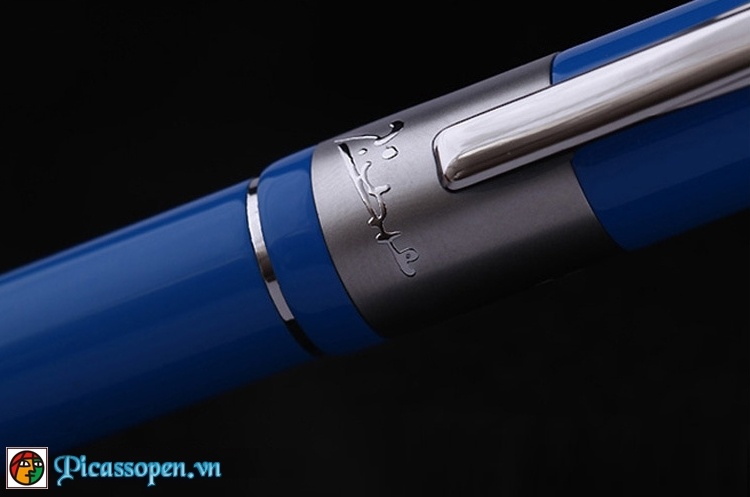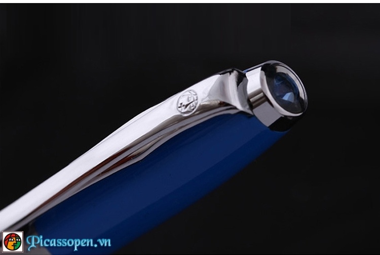 Đỉnh bút được đính chìm viên đá màu xanh, Logo Picasso khắc chìm ở cài bút.