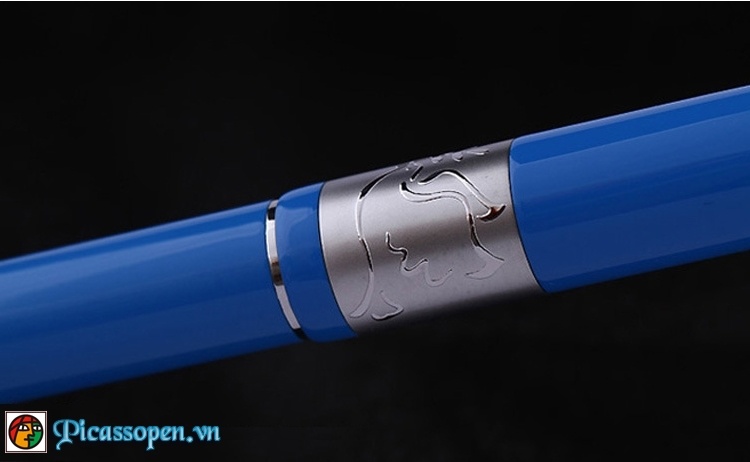 Nắp bút Picasso 923 màu xanh có thiết kế đặc biệt với vòng tròn màu bạc, mặt trên nạm nổi Logo chữ Picasso ở mặt trước nắp bút